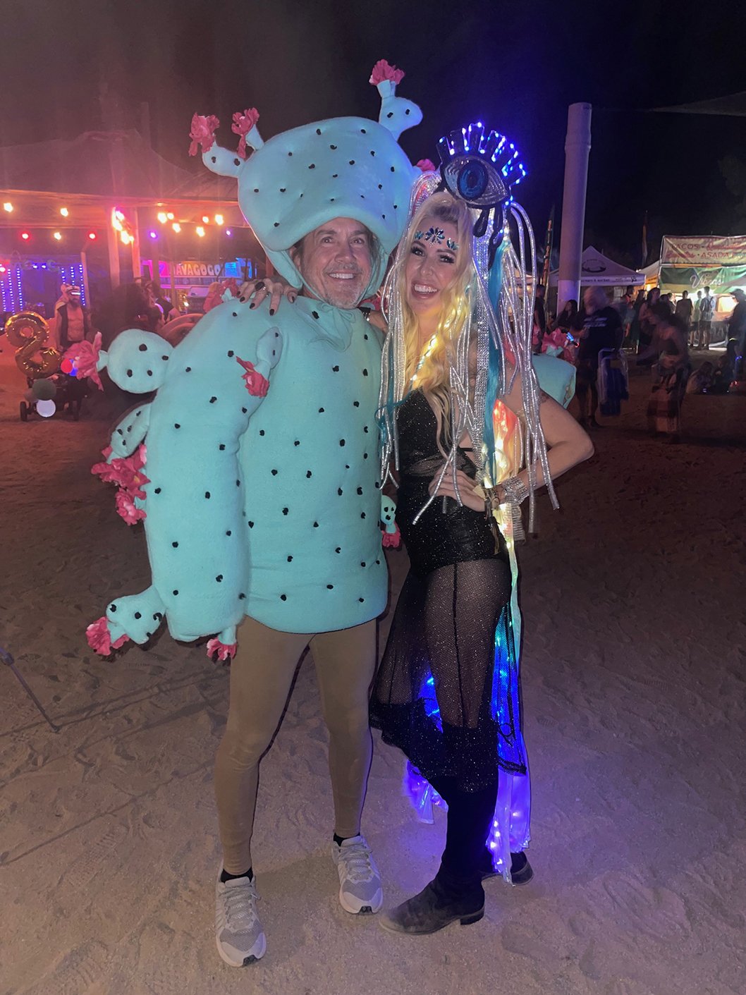 One of the festival's most captivating elements is its attendees' creative and eclectic attire. Throughout the event, one could spot a dazzling array of costumes that reflect the whimsical and imaginative spirit of the festival. Among the crowd were eye-catching handmade creations such as a LED light and sparkle-studded all-seeing eye hoverign above the dance floor, a huggable fluffy plush beavertail cactus , Disco Jesus complete with white robe and gold disco chains spreading groovy vibes and heavenly hugs at the silent disco, and a shirtless gold flacked Cupid donning illuminated wings. These inventive outfits add to the vibrant atmosphere, creating a visual spectacle that enhances the overall sense of celebration and creativity permeating the festival grounds.